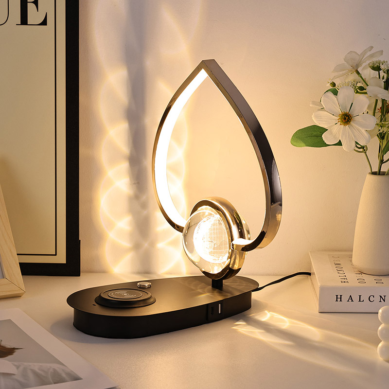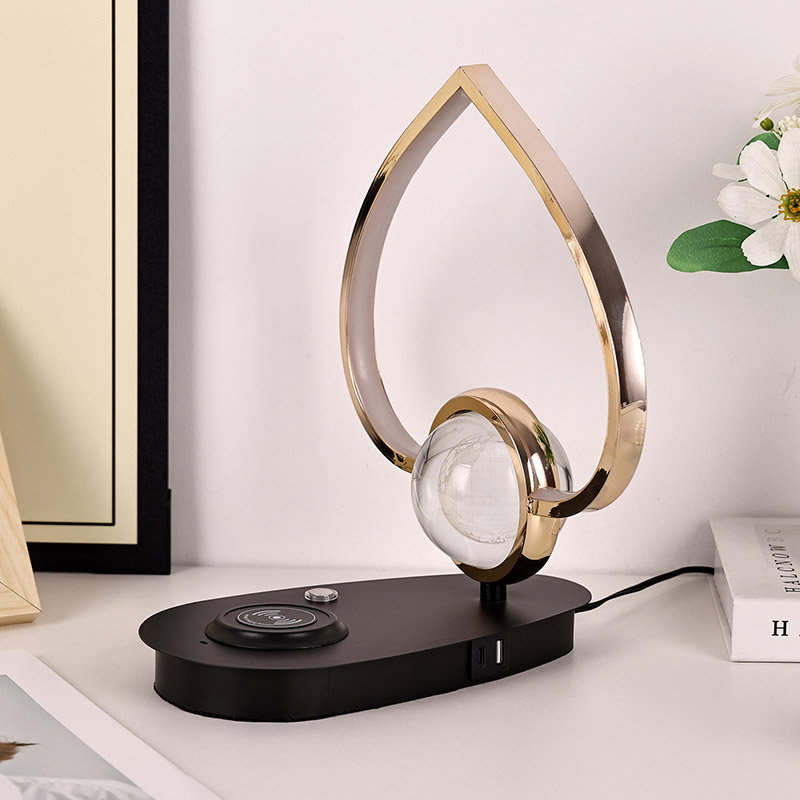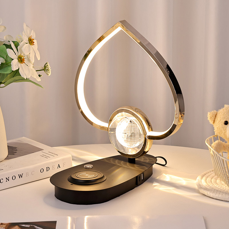हार्ट शेड के साथ अर्थ वायरलेस चार्जर एलईडी डेस्क लैंप एक धातु मुख्य संरचना से बना है।