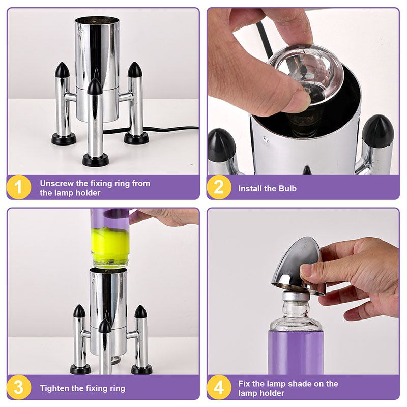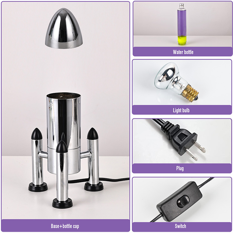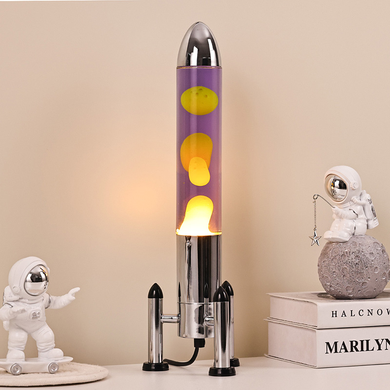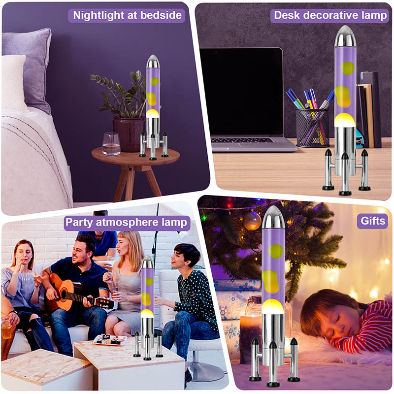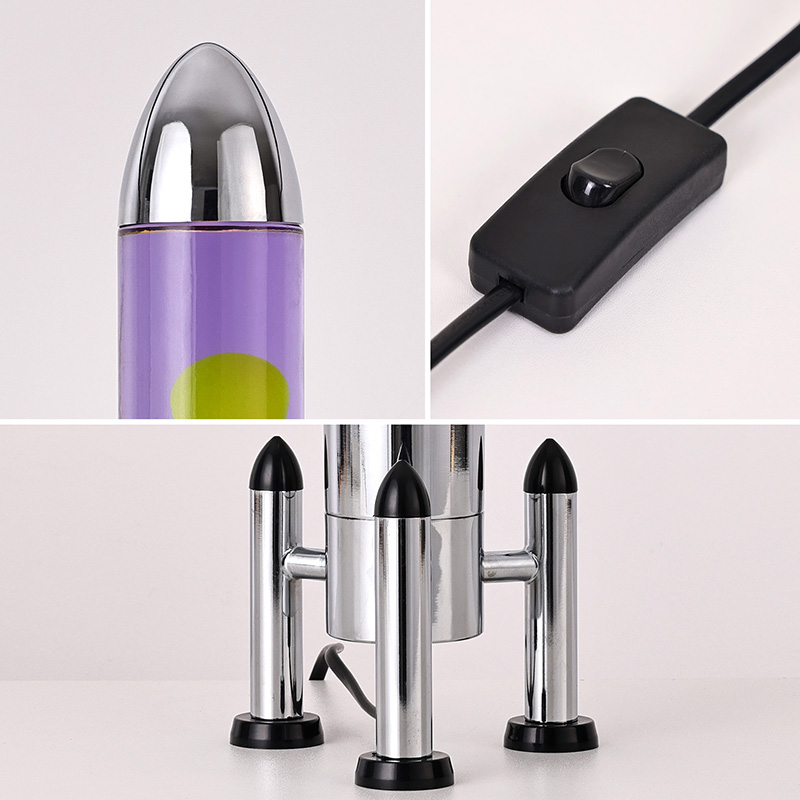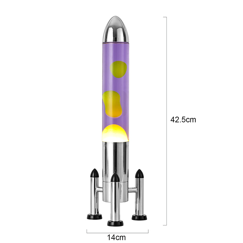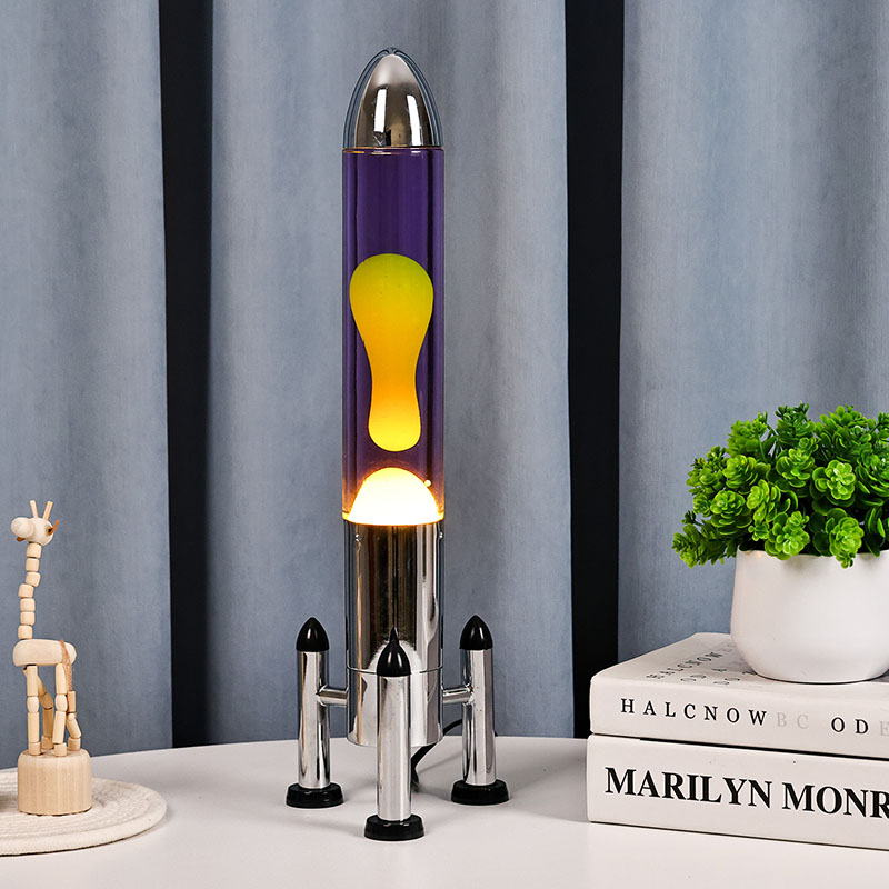 24Vरॉकेट शेड के साथ बड़े एलईडी लावा लैंप में एक क्लासिक रॉकेट आकार का डिज़ाइन है, जिसमें पारदर्शी कांच की बोतल बॉडी के साथ चांदी की धातु का खोल है, जो सरल लेकिन स्टाइलिश है। पीला अंदर बैंगनी तरल पदार्थ में तैरता है