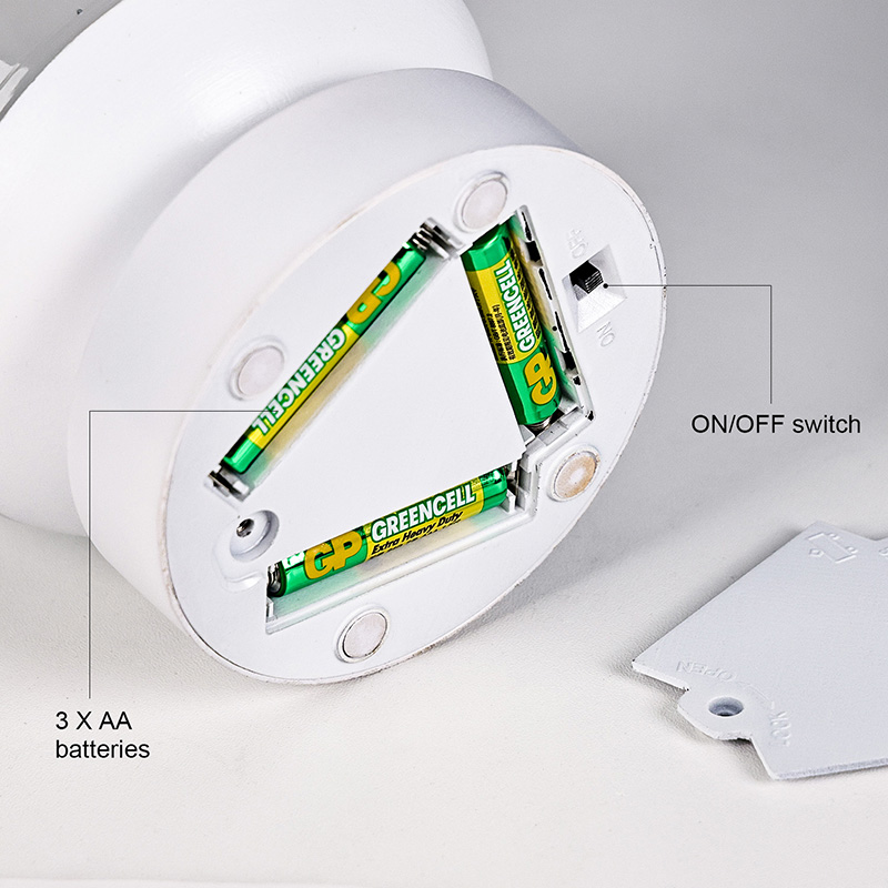 प्लग इन करने की कोई आवश्यकता नहीं; इसे केवल 3 AAA बैटरियों द्वारा संचालित किया जा सकता है, जिसमें सरल इंस्टॉलेशन और लचीला उपयोग शामिल है। चाहे उसे नाइटस्टैंड, डेस्क, बच्चे के पालने पर रखा गया हो, या कैंपिंग के लिए ले जाया गया हो