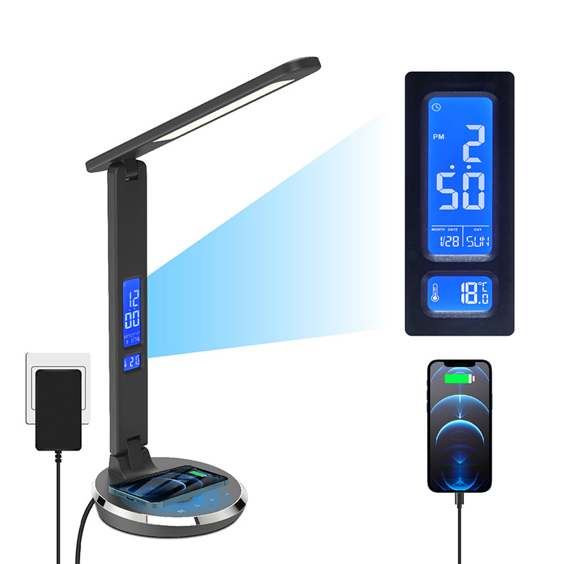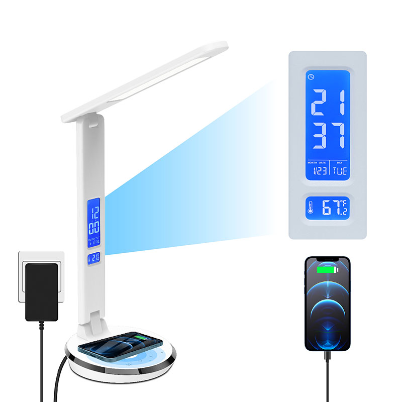 तापमान डिस्प्ले, समय, अलार्म घड़ी, बैक बॉडी कॉन्टोरल बटन के साथ सतत कैलेंडर के साथ एलसीडी स्क्रीन है। और डेस्क लैंप की छाया के पीछे यूएसबी चार्ज पोर्ट है।