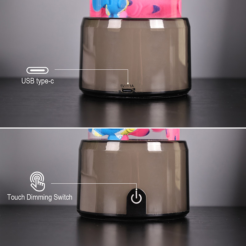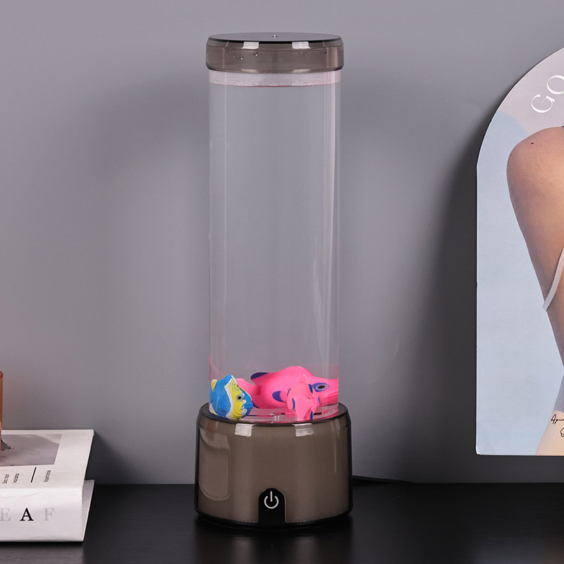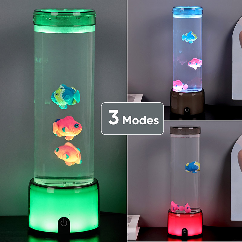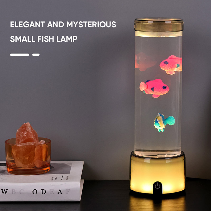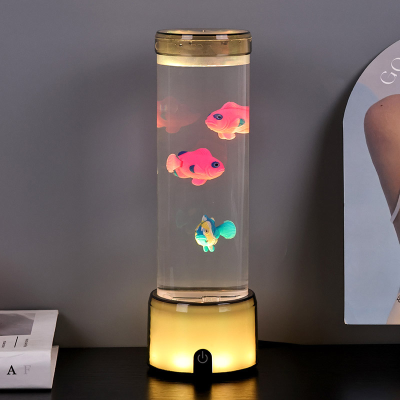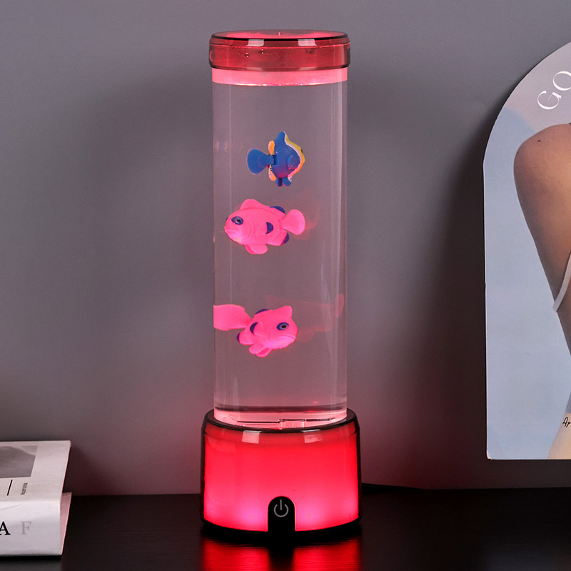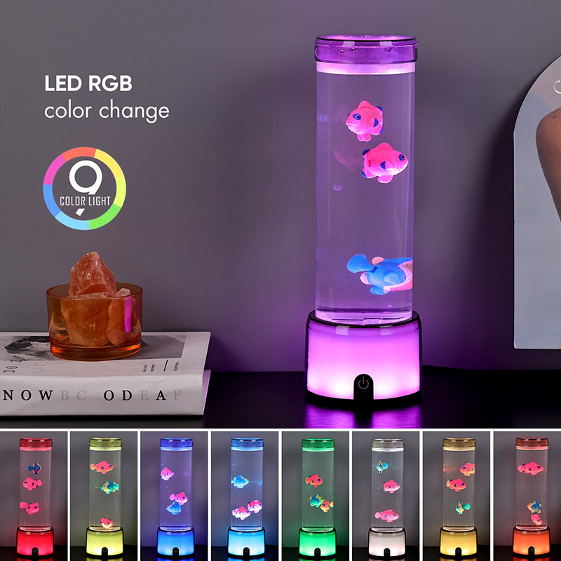 फिश लैंप का आधार एक आरजीबी रंग बदलने वाले पारदर्शी आधार से सुसज्जित है, जो प्रकाश के कई रंगों का उत्सर्जन कर सकता है, जिससे संपूर्ण लैंप बॉडी एक रंगीन प्रभाव प्रस्तुत करती है। स्विच ऑन करने के बाद कलर करें