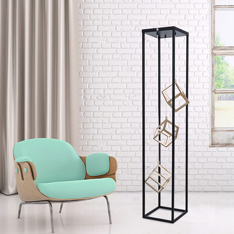 आधुनिक डिज़ाइन वाले फ़्लोर लैंप, उत्पाद की सबसे बड़ी विशेषता धातु से बना आयताकार फ्रेम आकार है, जिसके अंदर 3 वर्ग एलईडी झूमर हैं। समग्र डिज़ाइन का उपयोग हॉल में सजावट के रूप में किया जा सकता है, और प्रकाश की तीव्रता को नियंत्रित करने के लिए शीर्ष पर एक बटन है