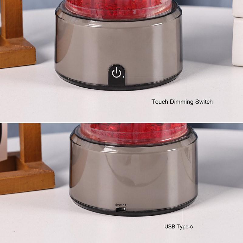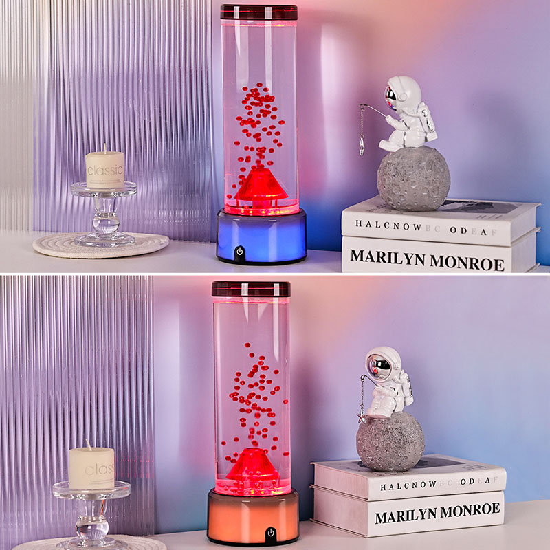 आधार एक नरम, विसरित प्रकाश उत्सर्जित करता है जो आंतरिक प्रदर्शन को पूरक करता है, आसपास की सतहों पर रंगीन प्रतिबिंब डालता है। चाहे इसका उपयोग रात की रोशनी, मूड बढ़ाने या बातचीत शुरू करने वाले के रूप में किया जाए, यह लैंप किसी भी सेटिंग के लिए सहजता से अनुकूल हो जाता है।