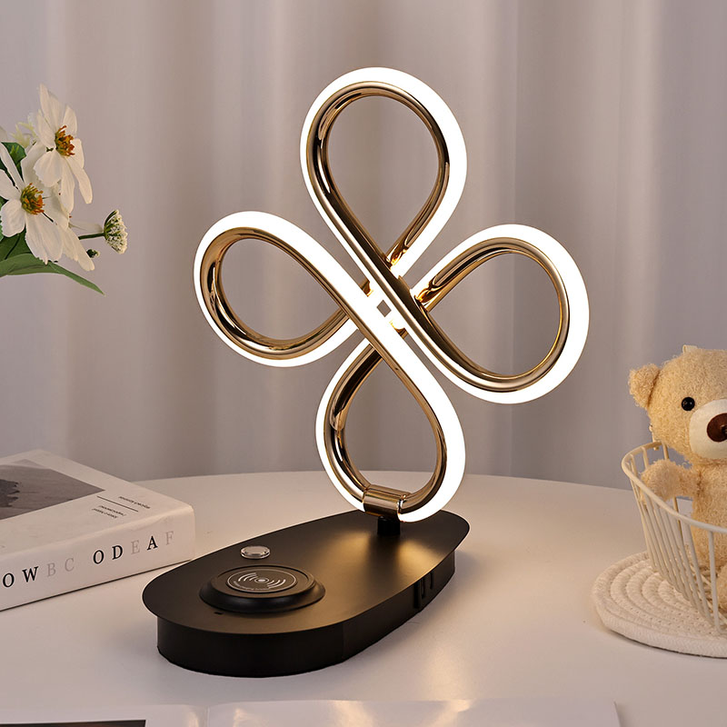 फ्लॉवर शेड के साथ वायरलेस चार्जर एलईडी डेस्क लैंप एक धातु मुख्य संरचना से बना है।