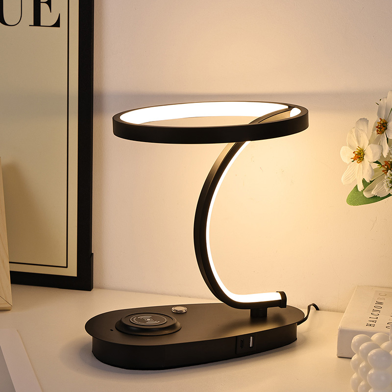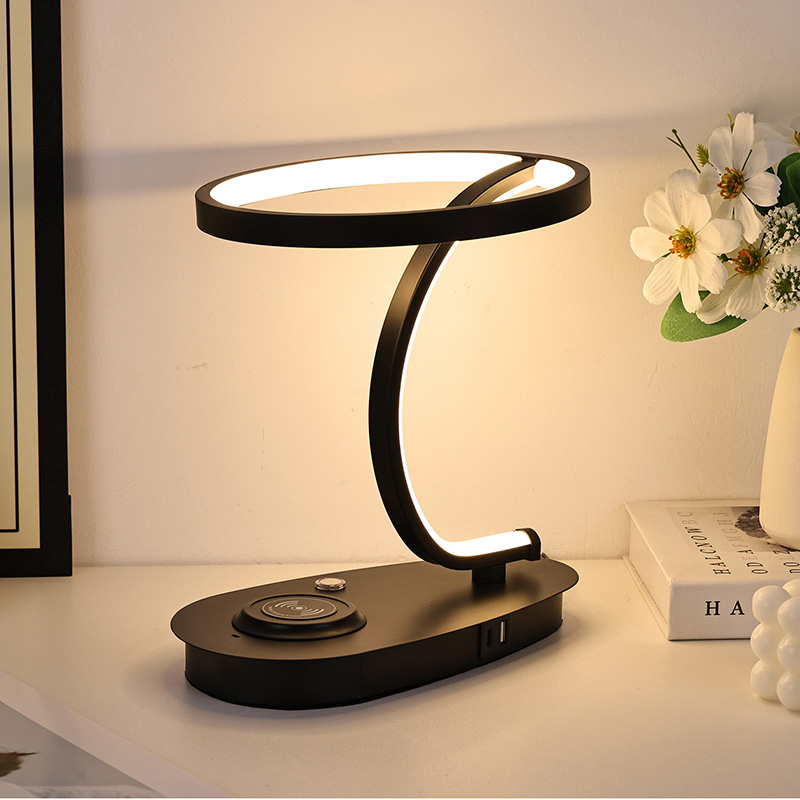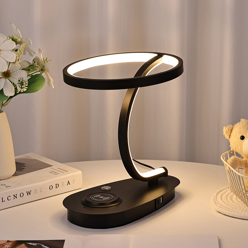 रिंग शेड के साथ वायरलेस चार्जर एलईडी डेस्क लैंप एक धातु मुख्य संरचना से बना है।